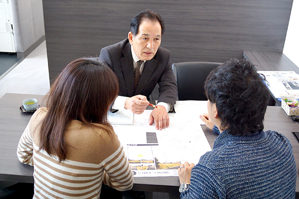 土地の情報などをお伺いしたうえで、建てたいマイホームのイメージについて担当者とお打ち合わせさせていただきます。 皆様のマイホームへの想いやご希望を残さずお聞かせください。約1~2週間でプランと資金計画書をご提示いたします。