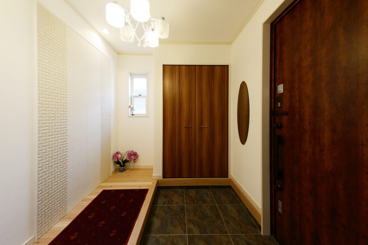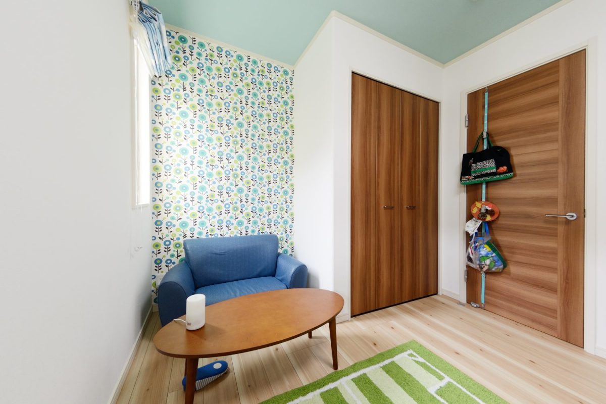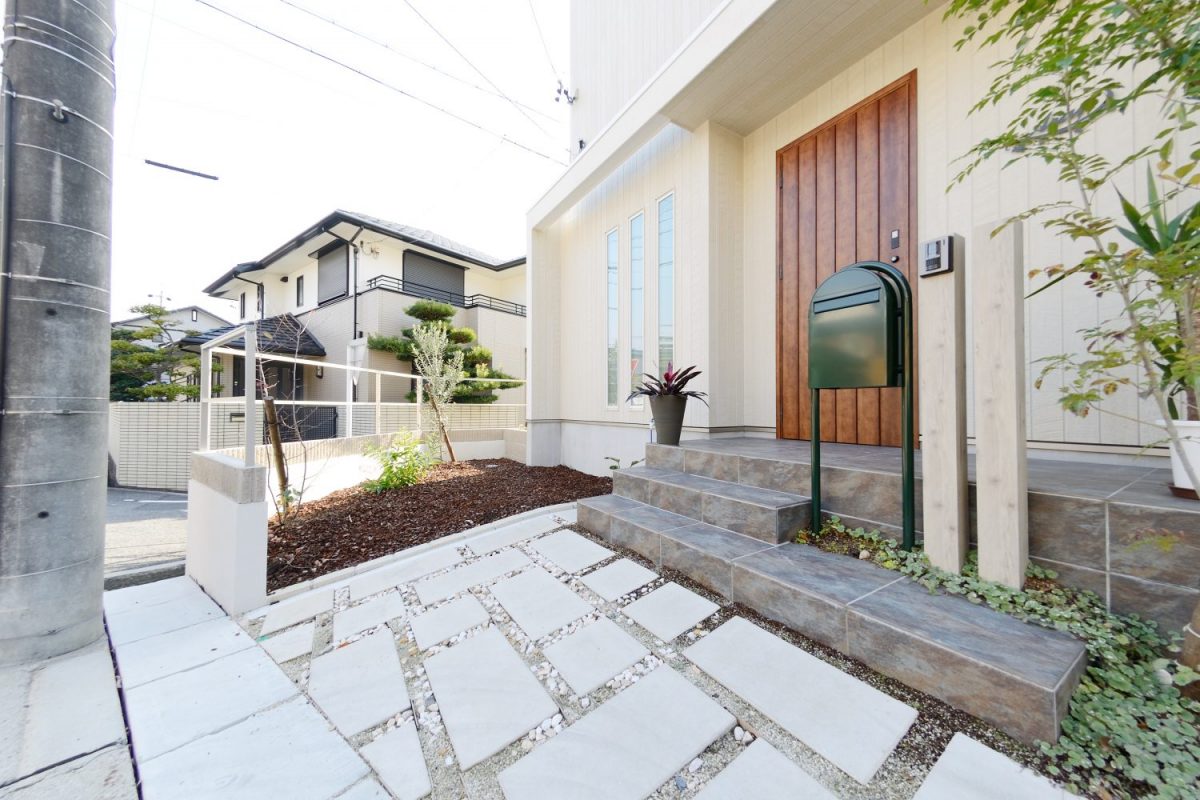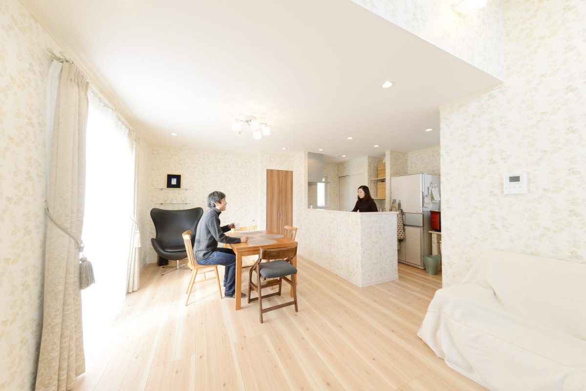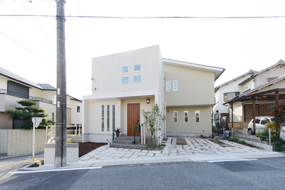 外観はオフホワイトの木目調×ベージュ、室内も上品なアクセントクロスや木目を用い、大人な雰囲気に仕上げました。