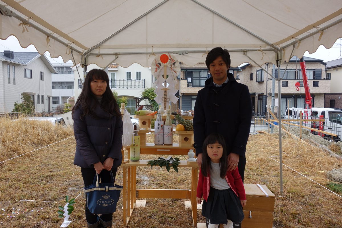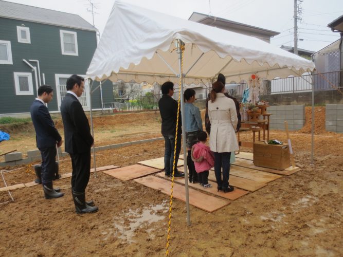 雨天が続いていましたので天気が心配でしたが、なんとか雨に降られず地鎮祭を迎えることが出来ました。土地の造成工事が大方終わり、これから本格的に建物の着工が始まります。まだまだ実感は沸いていませんが、これからより新しいマイホームの姿が具体的になっていくことがとても楽しみです。工事の安全を祈って、これからも宜しくお願いいたします。