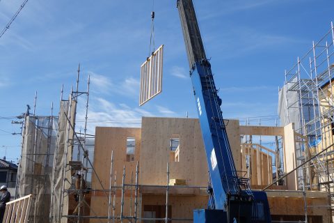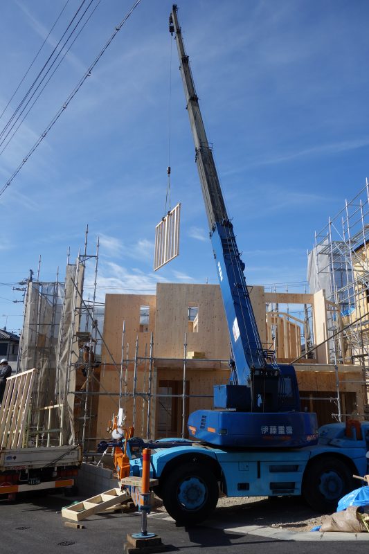 敷地に高低差もあり、造成の工事にけっこうな時間がかかりましたが、やっと家が建ってきたと実感することができました。朝からバタバタしていて、昼頃にやっと見に来ることができたら、もう2階部分の作業に入っていってびっくりしました。今日中におおよそ出来上がるそうなので、年内はきりのいいところで終わって、また来年から4月の完成までよろしくお願いします。